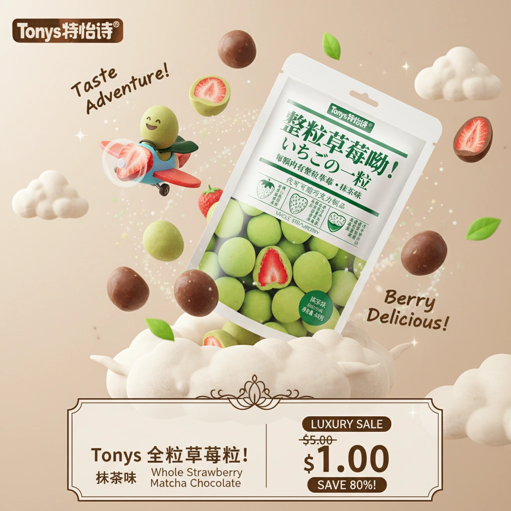 សូកូឡាស្ដ្របឺរីរសជាតិតែបៃតង Tonys ផ្តល់នូវបទពិសោធន៍រសជាតិដ៏ប្លែក និងទាក់ទាញ។ ផ្លែស្ដ្របឺរីទាំងមូលដែលសម្បូរទៅដោយវីតាមីន C ត្រូវបានស្រោបដោយសូកូឡាទឹកដោះគោដែលមានរសជាតិតែបៃតង matcha ដ៏ស្រស់ស្រាយ។